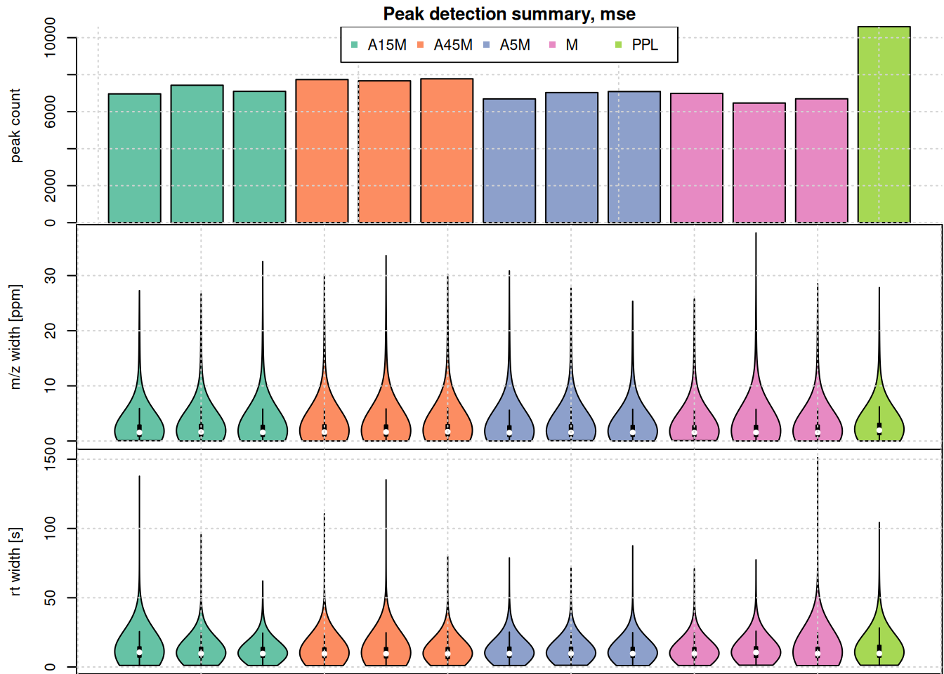 mse <- filterSpectra(mse, filterRt, c(20, 850))BPC and TIC aggregate data along the m/z dimension per spectrum (retention time) to compare the signal measured along the retention time. To compare the mass or ion content of the individual samples/measurement runs we in addition aggregate data along the retention time, for distinct m/z values.