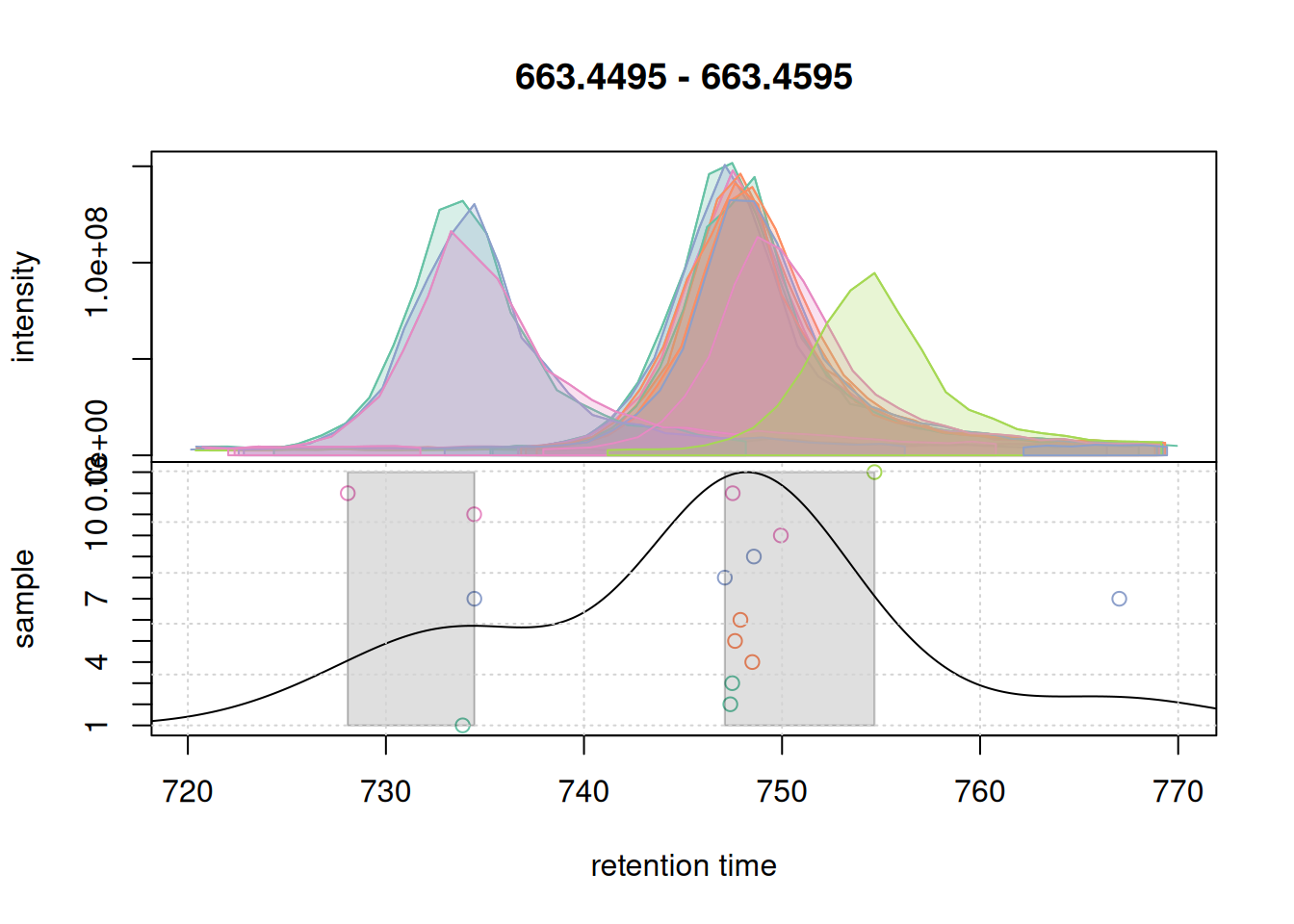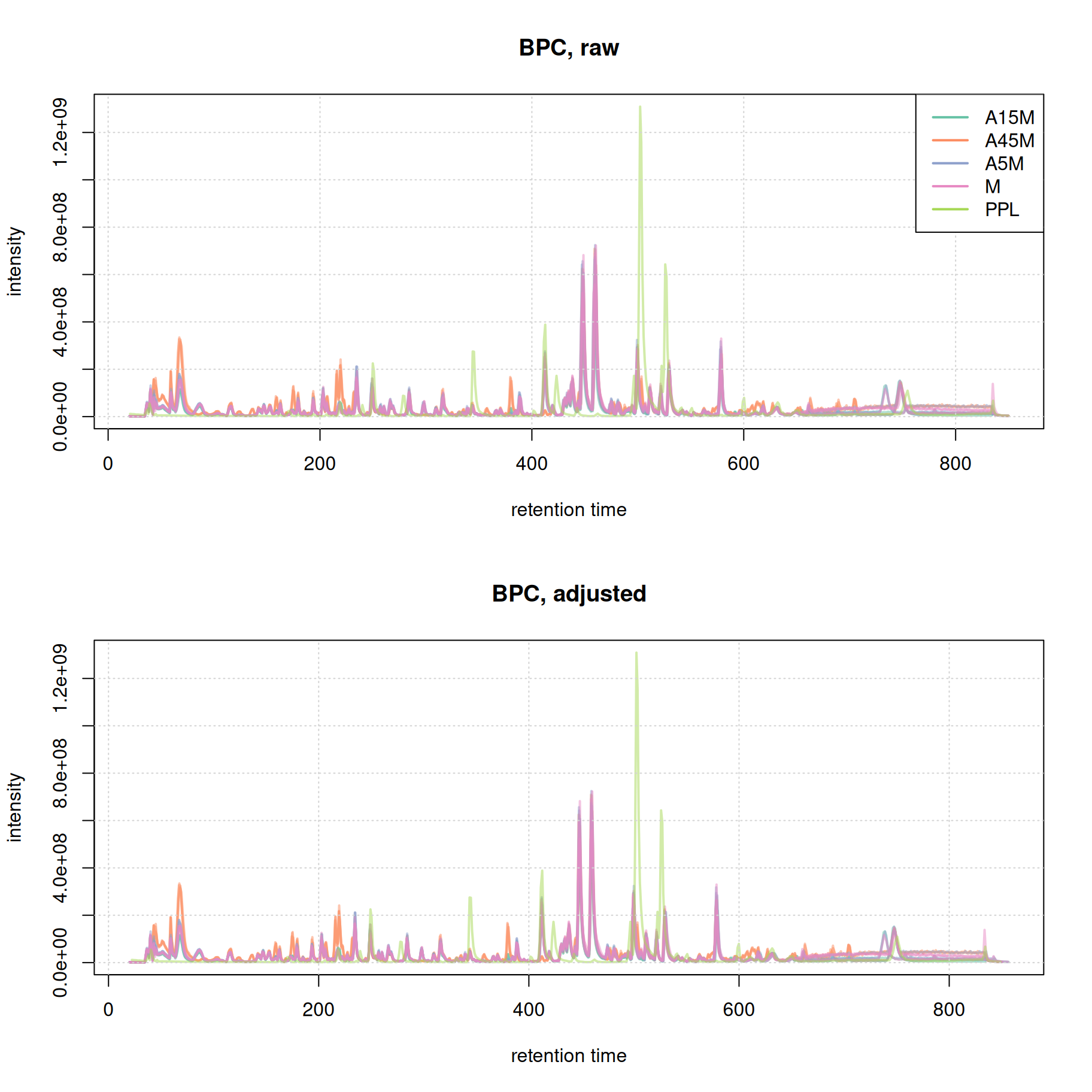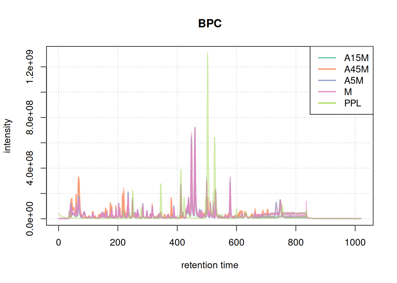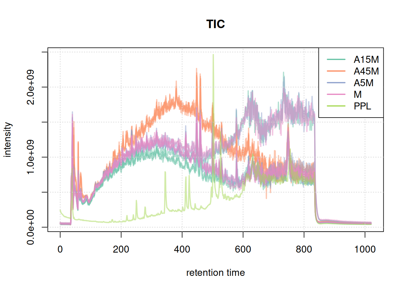Based on the BPC and TIC there seems to be little retention time shifts between the samples. Also, no signal seems to be present before 20 seconds and after 850 seconds. Thus, we below filter the data set to spectra acquired within this retention time range.