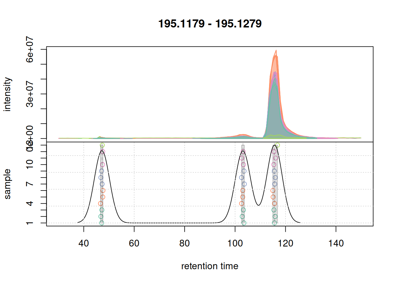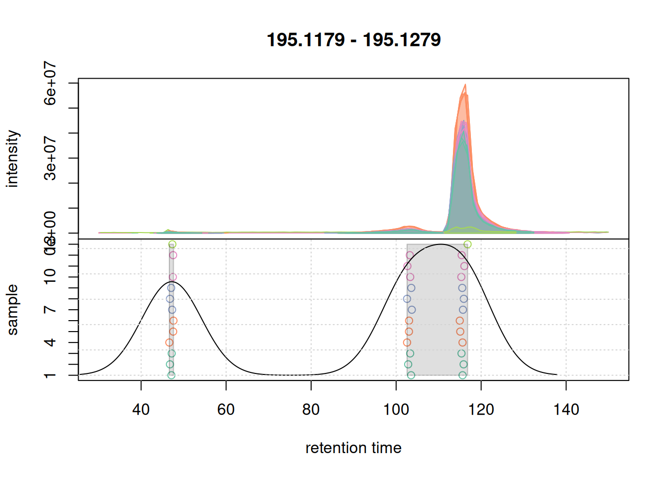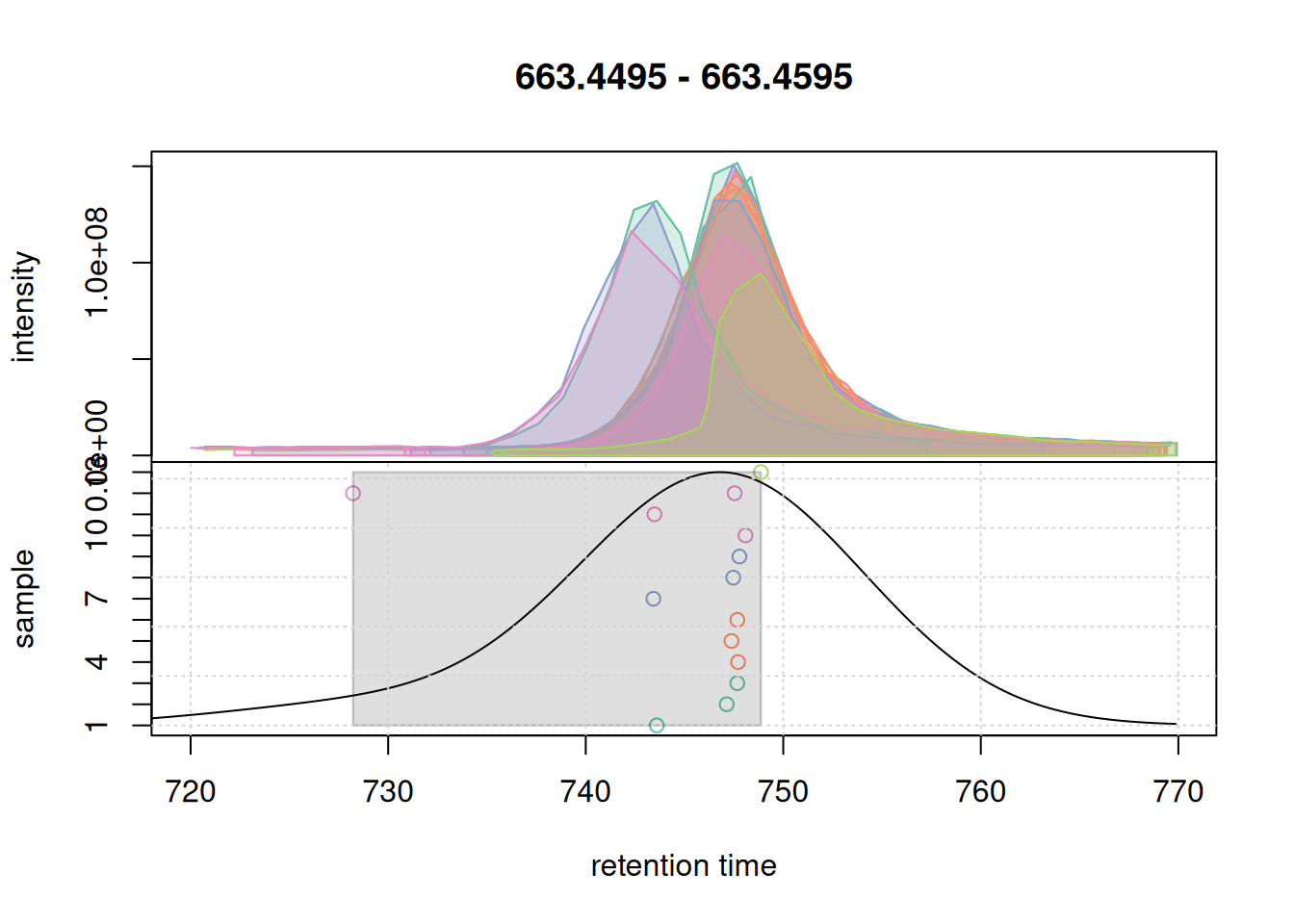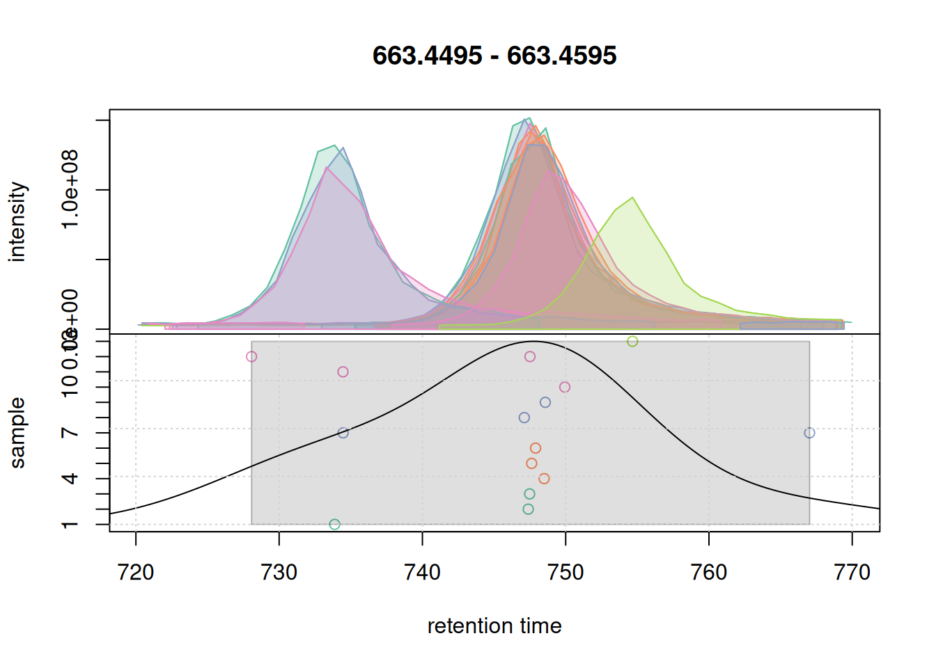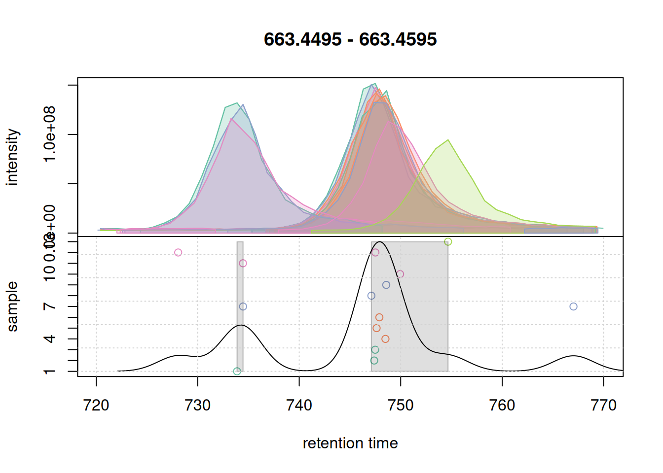 Based on the BPC and TIC there seems to be little retention time shifts between the samples. Also, no signal seems to be present before 20 seconds and after 850 seconds. Thus, we below filter the data set to spectra acquired within this retention time range.