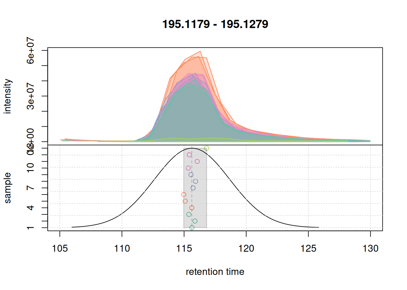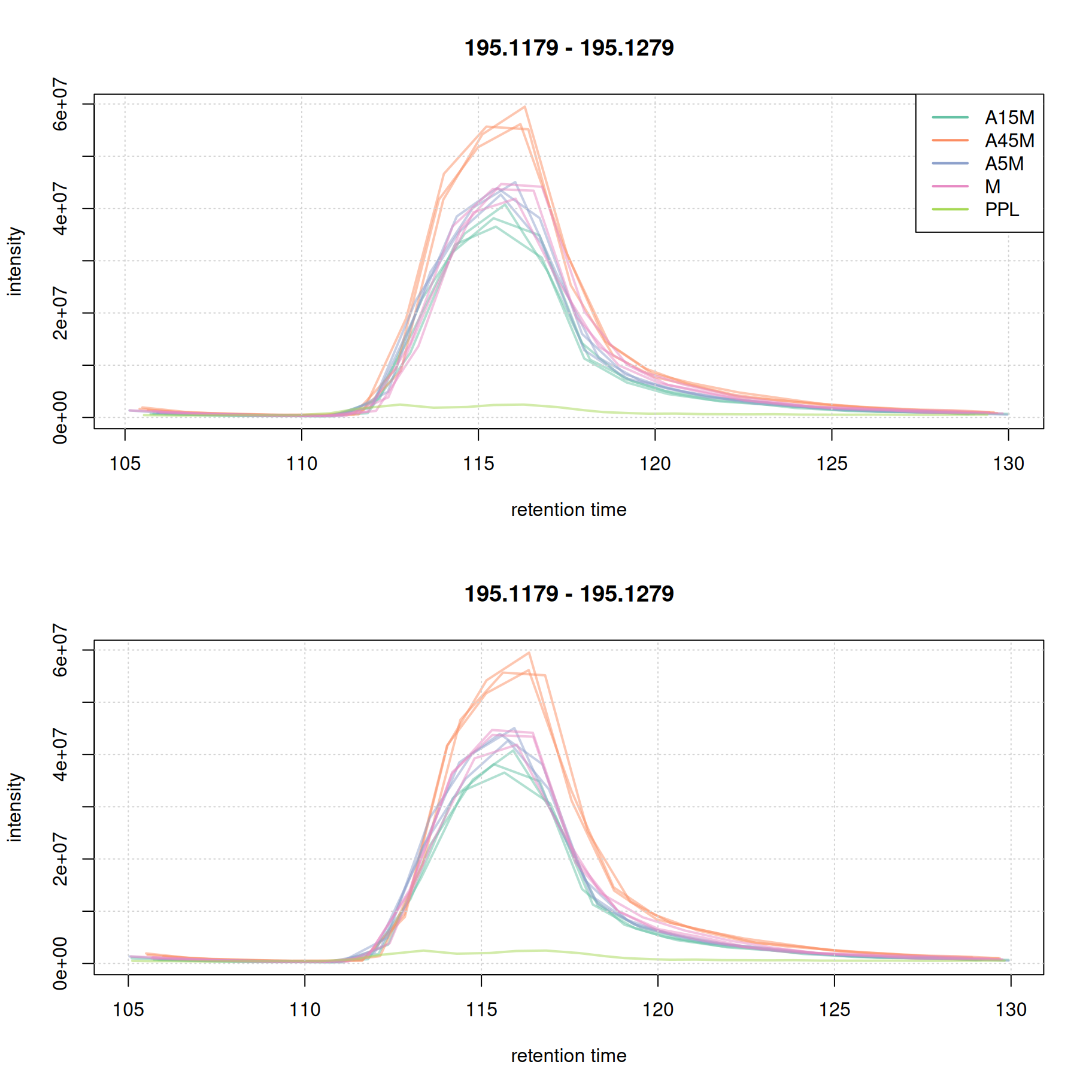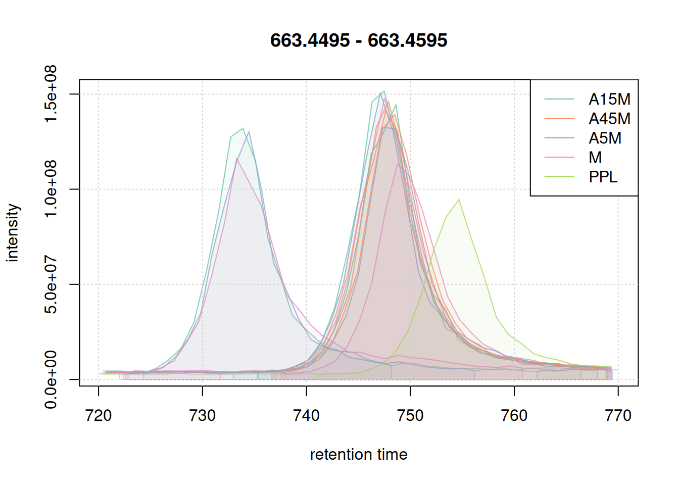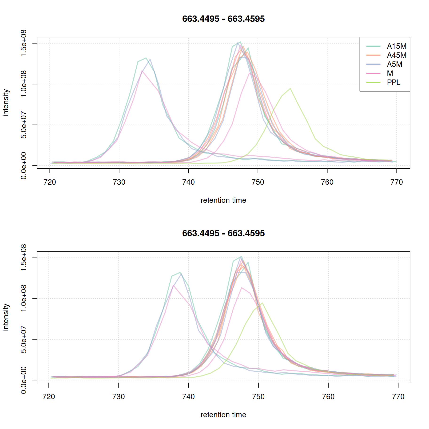 Based on the BPC and TIC there seems to be little retention time shifts between the samples. Also, no signal seems to be present before 20 seconds and after 850 seconds. Thus, we below filter the data set to spectra acquired within this retention time range.