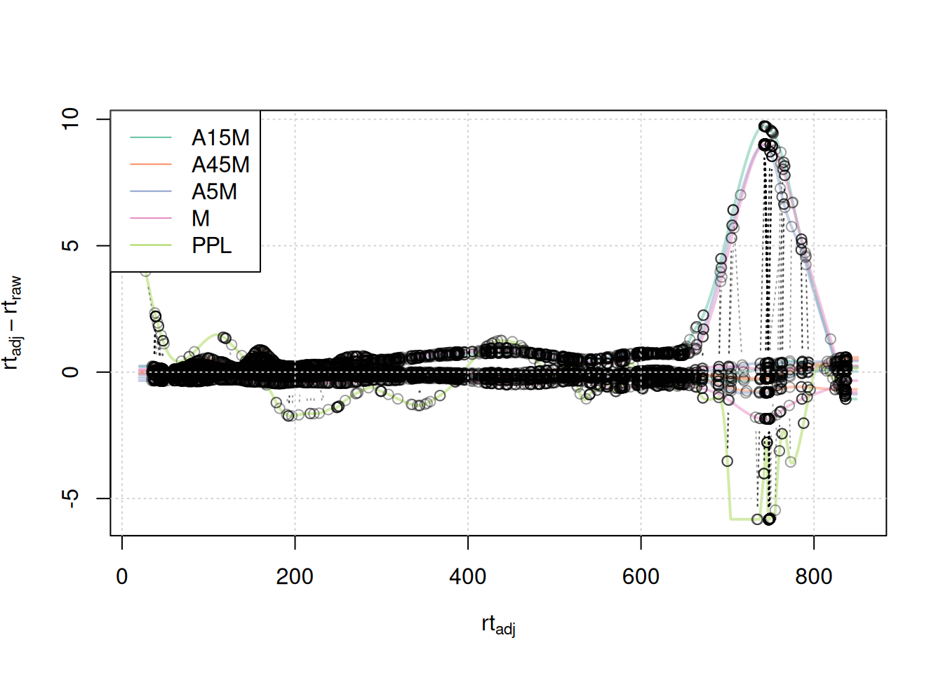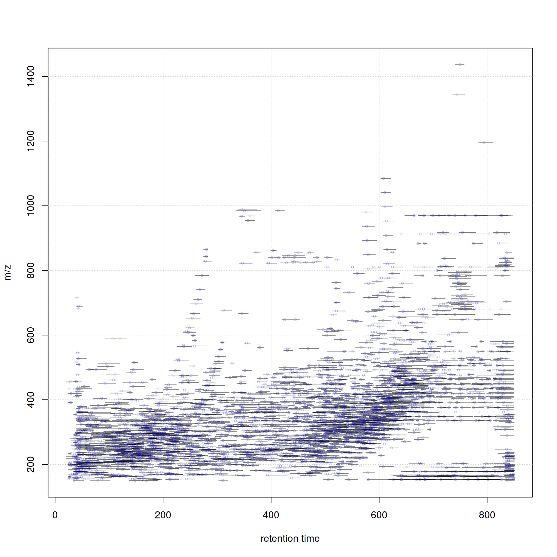 #' filter the data set to a retention time range from 20 to 850 seconds
