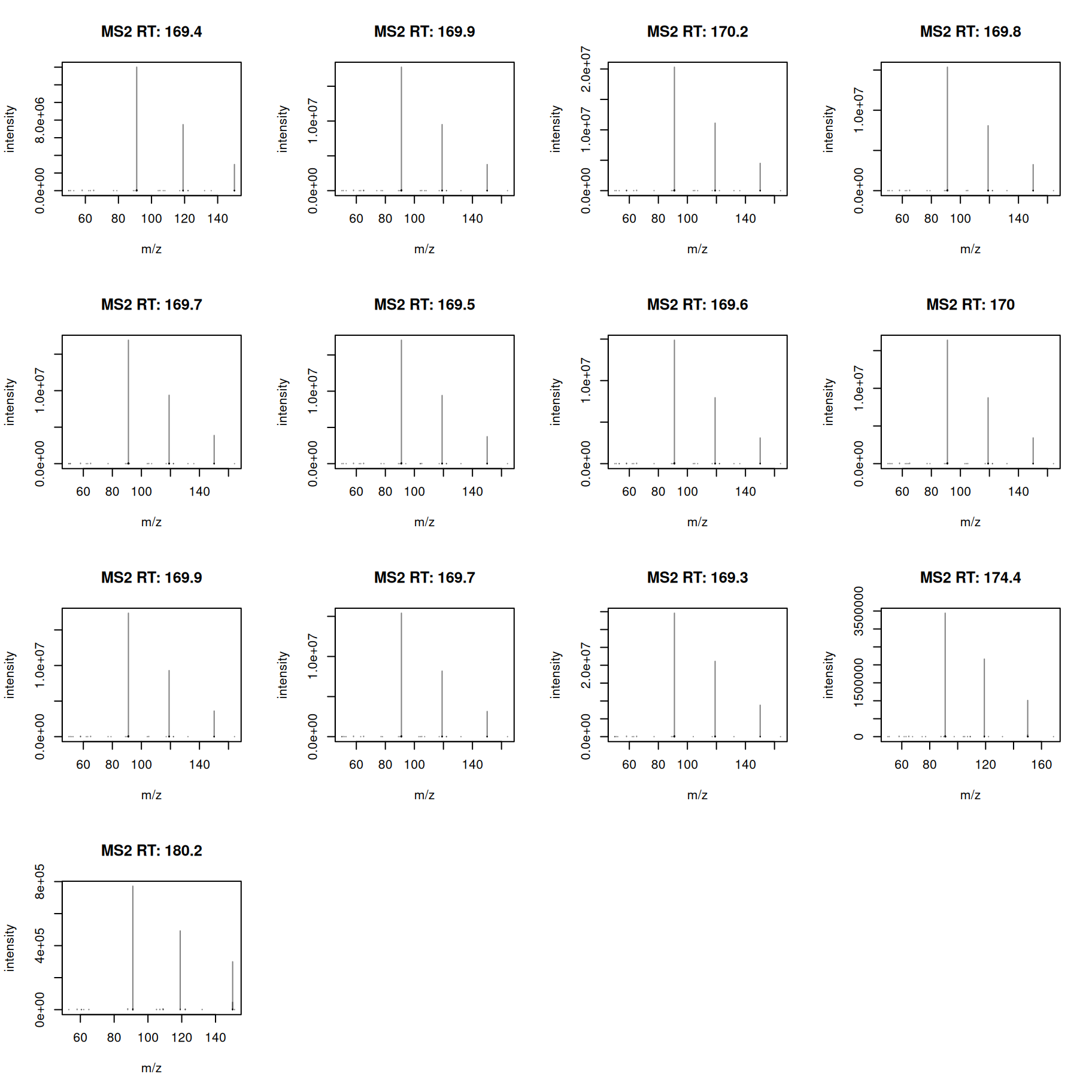ms2_cons <- formatSpectraForGNPS(ms2_cons)And finally we export the MS2 spectra in MGF format.